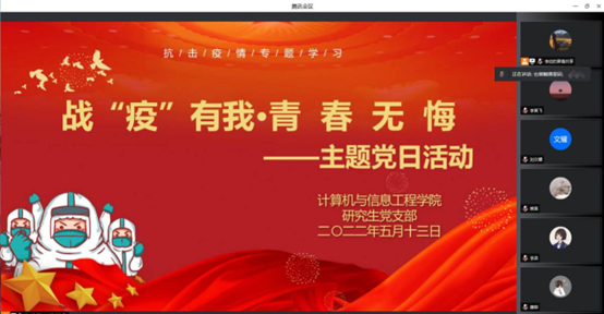 为深入贯彻全国抗疫精神,5月13日上午,计算机公司研究生党支部开展“战“疫”有我·青春无悔”线上主题党日活动,全体党员及入党积极分子参加了本次活动。