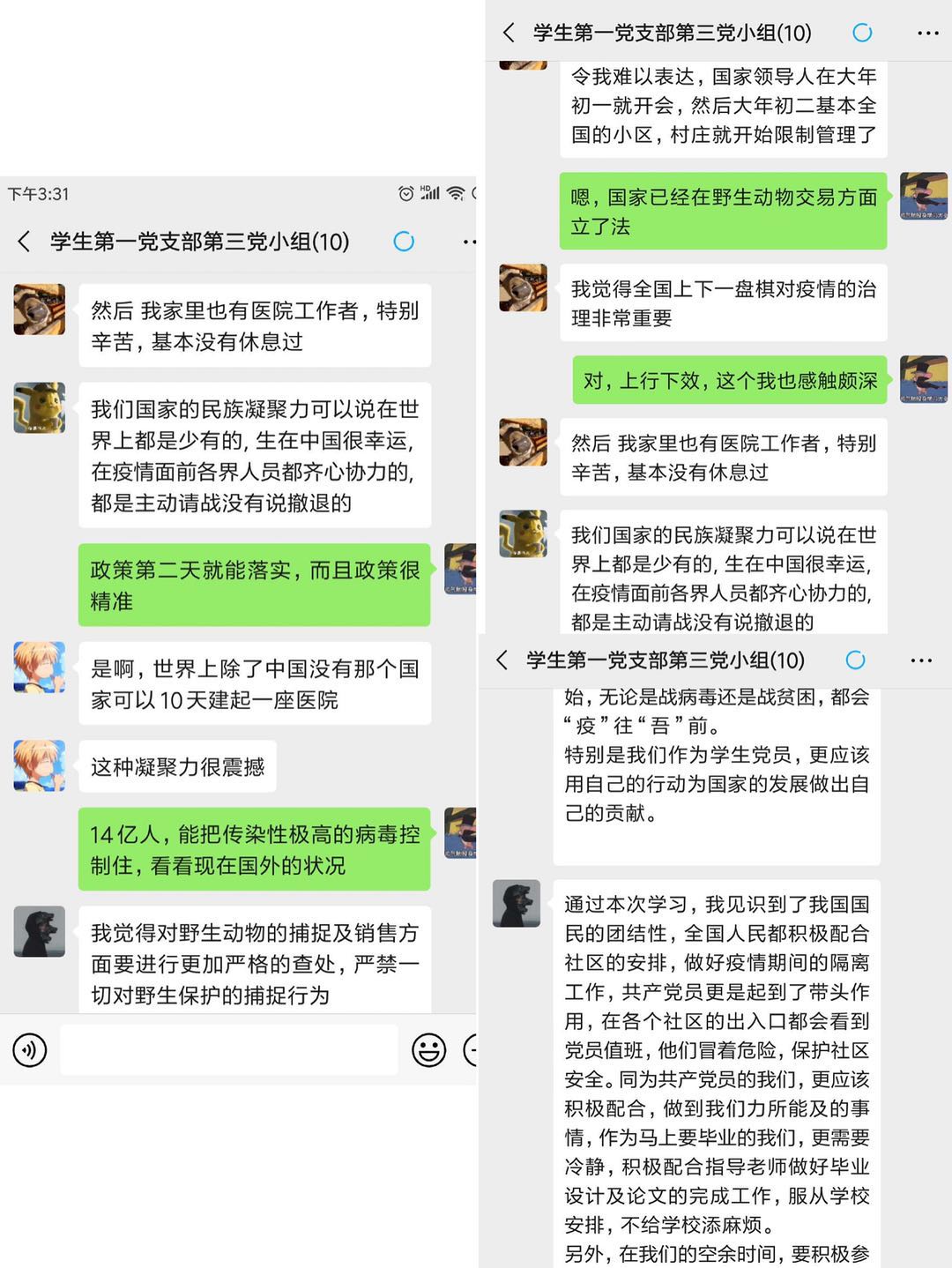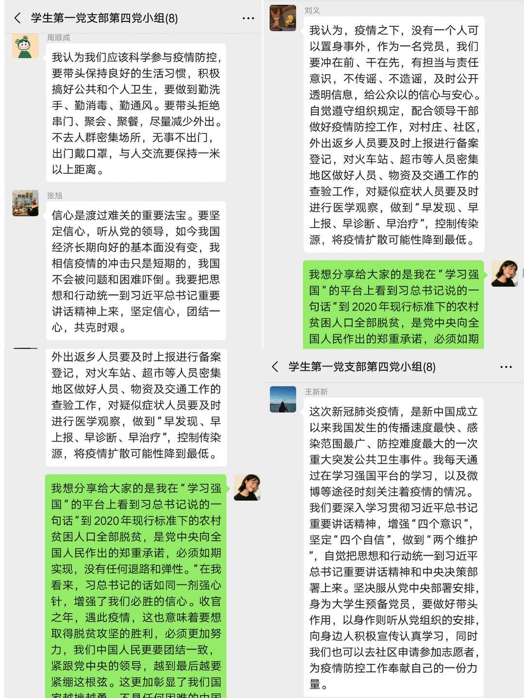 此次党日活动分为七个党小组进行,分为自学与集体分享讨论两个环节,各党小组组织线上学习习近平总书记关于疫情防控相关指示精神,包括习近平总书记在统筹推进新冠肺炎疫情防控和经济社会发展工作部署会议上的讲话等内容,通过群内讨论、视频、语音会议等不同形式学习习近平总书记精神,分享学习心得。各党小组积极组织,现场讨论激烈,同学们共同分享疫情期间最感动的人物或事件、最大的感受、疫情期间中共党员的责任与担当等内容。公司员工党员叶磊、江雨点、姚洁、张阿杰、张红等7名同学也分享了作为疫情防控志愿者的收获,在员工党员间起到了示范引领作用。