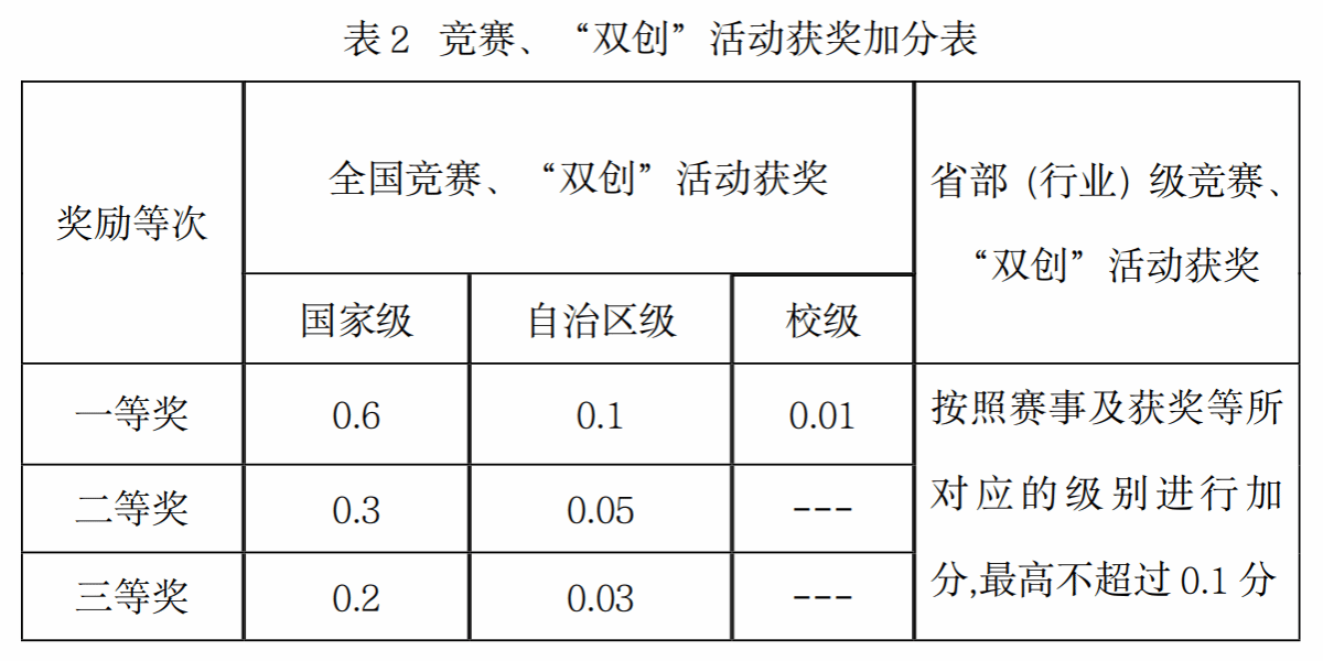 赛、“双创”活动获奖等可予以加分(详见表 2),按照赛事及获奖等所