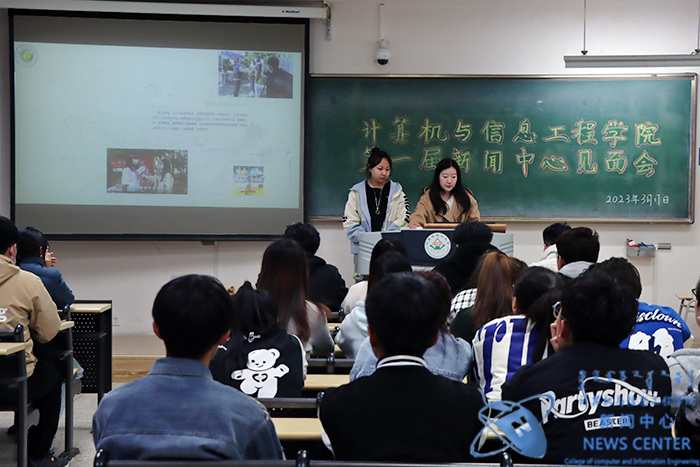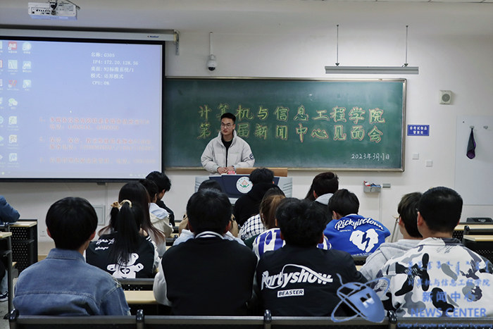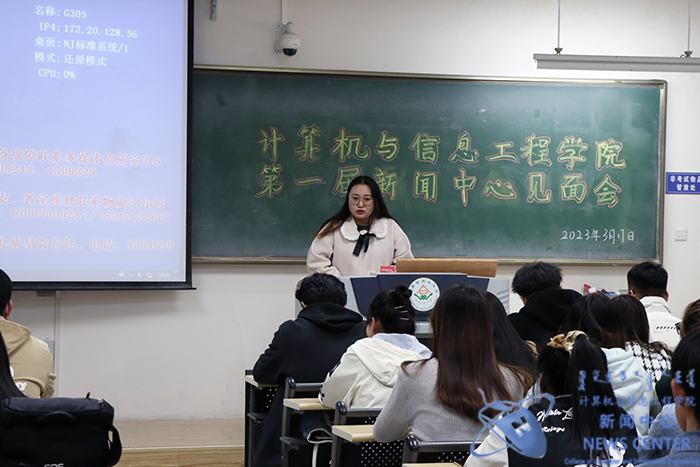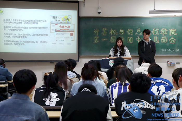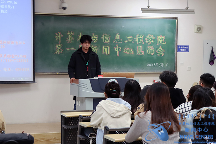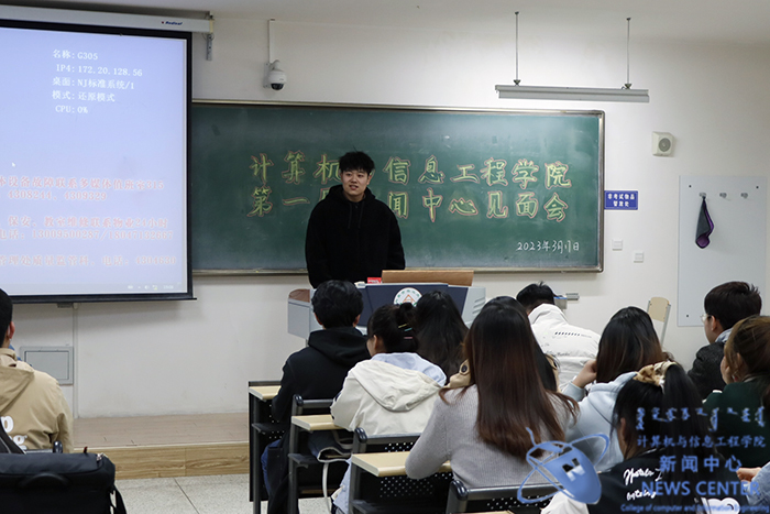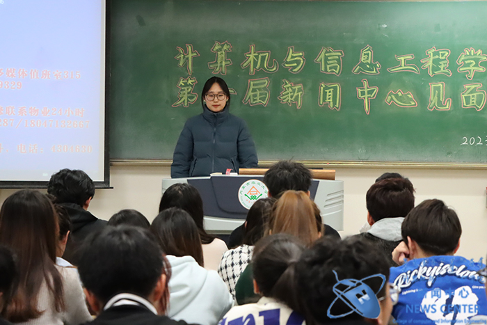 第一届新闻中心主任范恒源对本学期加入新闻中心的同学表示欢迎,同时对大家新一年的工作提出要求,希望同学们要有时间观念,工作的同时兼顾学习,并保持敏捷的新闻思维,发扬团结精神。第一届新闻中心主任雷羊羊、赵娜希望全体成员在今后的工作和学习中互相帮助,共同成长。随后,新闻中心美工部副主任王嘉杰,编辑部副主任王娟、王佳颖,运营部副主任董倩、陈关根分别介绍本部门的特色与工作重点。第一届新闻中心成员依次上台进行自我介绍,表达自己对新闻中心的美好愿景。会议最后,全体成员进行合影留念。