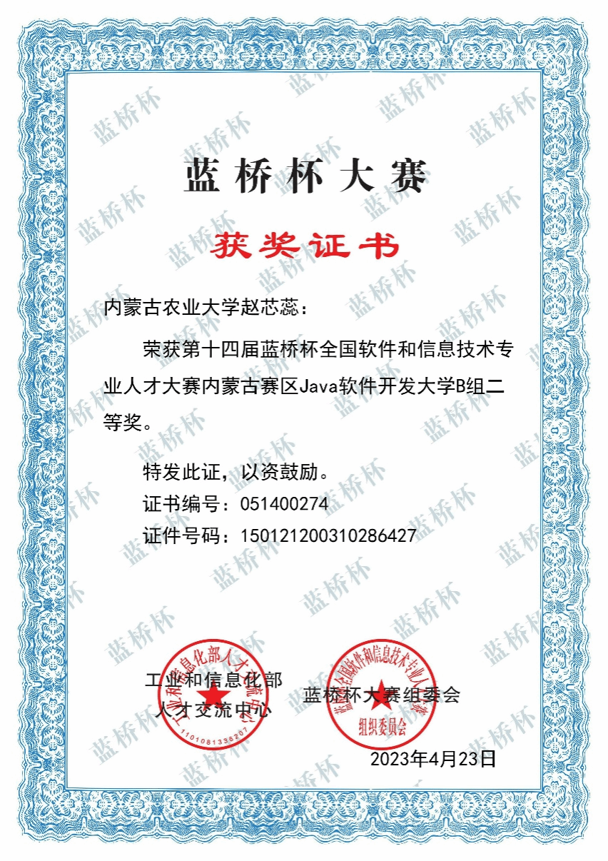 2023年4月获得第十四届蓝桥杯内蒙古赛区Java软件开发大学B组二等奖。
