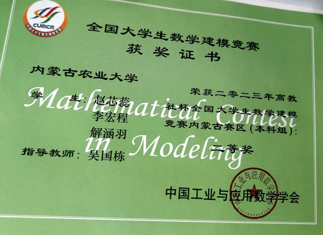 2023年9月获得全国老员工数学建模竞赛内蒙古赛区(甲组)赛区二等奖。
