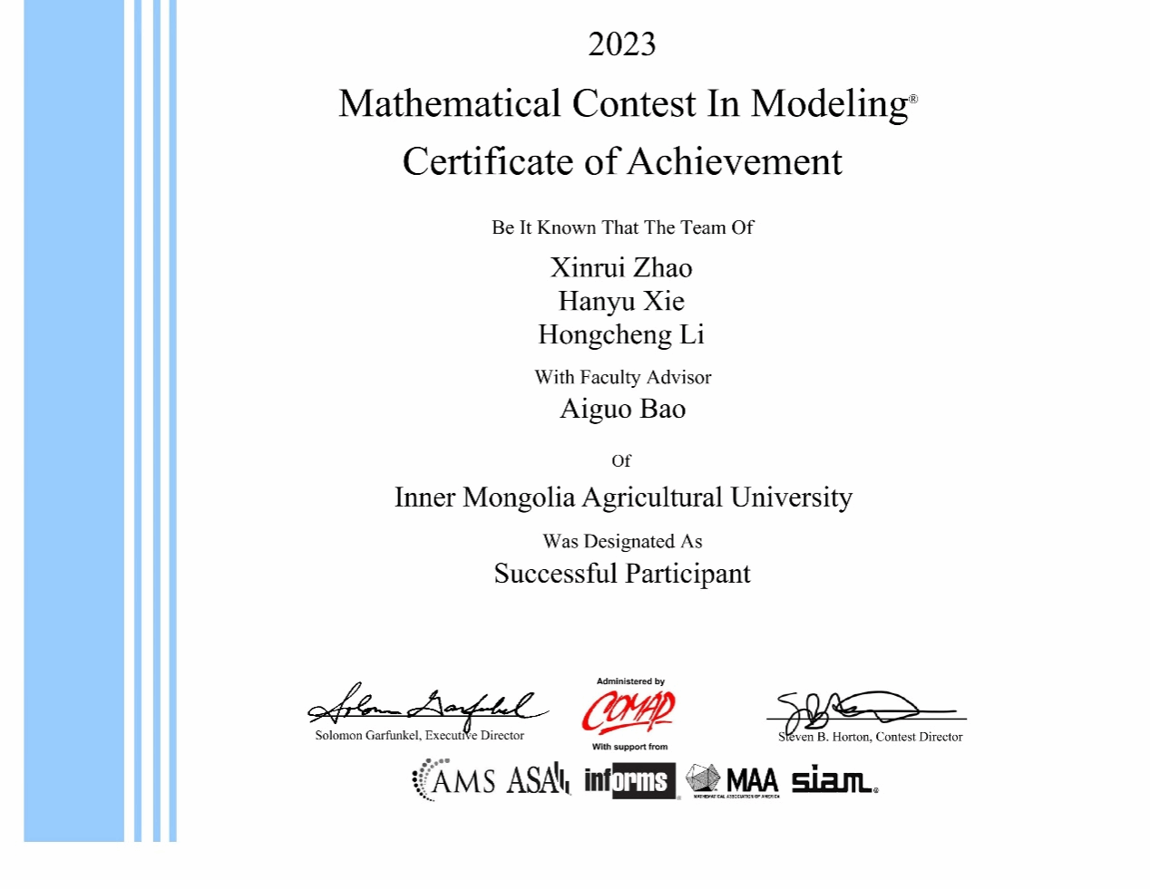 2023年5月获得美国老员工数学建模竞赛S奖。