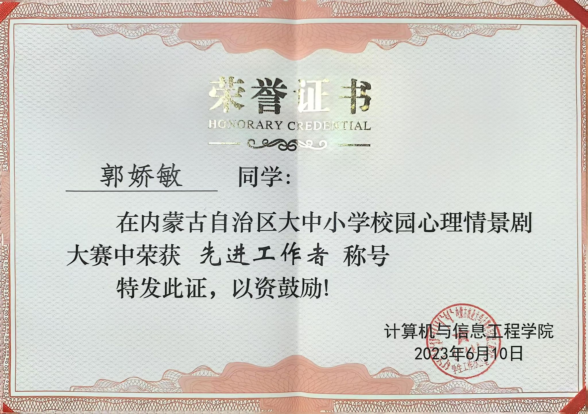 2022-2023学年 获得内蒙古自治区大小公司园心理情景剧“先进工作者”称号