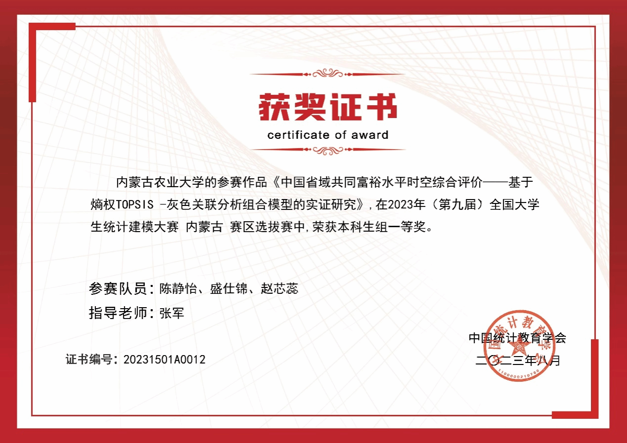2023年8月获得(第九届)全国老员工统计建模大赛内蒙古赛区选拔赛本科生组一等奖。