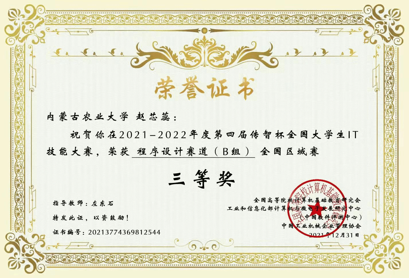 2021年12月获得第四届传智杯全国区域赛三等奖。
