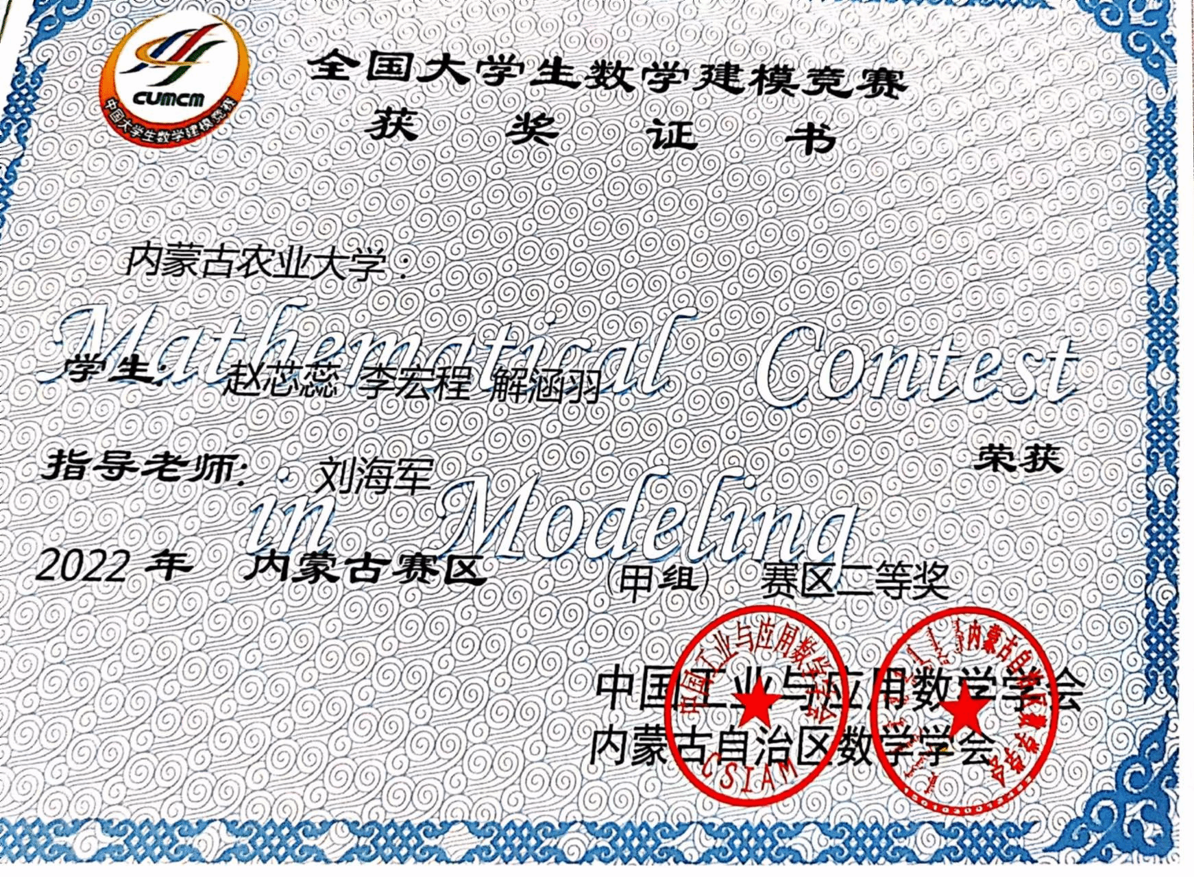 2022年9月获得全国老员工数学建模竞赛内蒙古赛区(甲组)赛区二等奖。