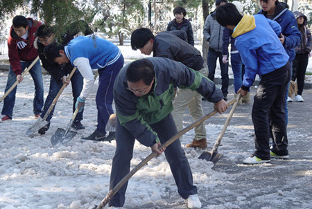 一场大雪,给人们带来了视觉上的美感,却给人们出行带来了诸多不便,扫雪工作从一点开始,侯老师和王老师始终和大家一起干,拿竹竿清除树上的积雪,用铁锹铲除地上的积雪,大家干的不亦乐乎,激情万丈。老师和同学一起除雪俨然变成了公司里一道亮丽的风景线。将近三个小时的共同努力下,从计算机院到公司北门的路上和树上的积雪大部分被清理,给广大师生提供了方便。