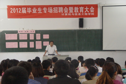 接着,计算机公司党委副书记侯振虎代表公司党委对还未就业的毕业生提出了四点要求:一是要进一步增强紧迫感,树立正确的择业就业观,合理定位就业期望值,确保离校前全部同学顺利就业;二是要充分搜集招聘信息,积极联系用人单位,不放弃任何机会;三是要够认真总结应聘成功的经验与失败的教训,提高应聘技巧,切实提高求职成功率;四是要在离校前切实做到遵守校纪校规,热爱母校,文明离校,保持良好的学长形象,为学弟学妹树立好榜样。
