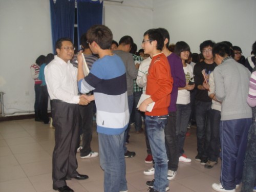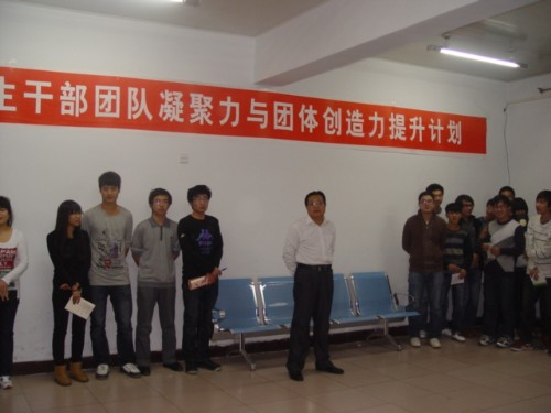 随后,在侯书记的引导下,大家进行了三个互动游戏。第一个游戏的目的在于加深员工干部之间的了解,扩大自己的人脉。在游戏过程中,大家相互握手并进行自我介绍,力求让对方认识自己;第二个游戏主要考察员工干部之间的信任度。一名同学站在高处,闭上眼睛,双手互握,放于颈部,其他人两两并排,相对而立,互相握住对方的手。准备就绪后,站在高处的同学向后倒下,整个过程不能有语言的交流;第三个游戏中,每两个同学一组,背靠背,臂揽臂,闭上眼睛,由一个同学引导另一个同学从三楼走到一楼学办后再返回,其间每位同学都扮演一次领导者与被领导者。这个游戏主要是让大家体会到领导者与被领导者的不易,互相体谅。