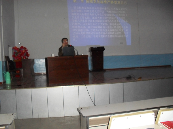 党课开始,周根宝教授对本期学员提出了要求,要求大家在学习过程中要全神贯注,注重自身的反思,不断加深对党的理解,领会党的思想精髓。随后在党课学习过程中,对于如何端正入党动机、树立正确的入党目标的问题,周书记向在座的学员进行了细致的讲解、剖析,他告诫大家一定要按照党员的标准严格要求自己,在实际学习、工作中严格履行党的章程。