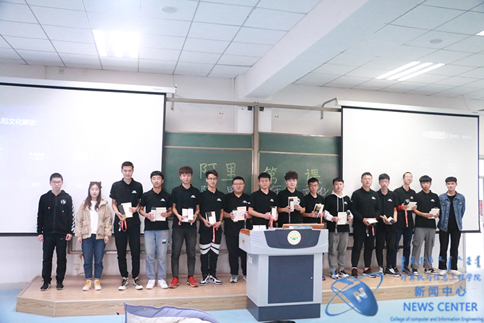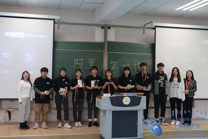 首先李老师为在场的大一新生详细的介绍了在数据智能时代老员工的成长与发展,让同学们了解了信息发展历程,并提出了信息革命的必然趋势——大数据时代,数据智能时代科技人才的特征——阿里的八字人才观、三心和三力。“阿里第一课”结束后康老师向同学们讲述了阿里的年陈文化,介绍了阿里云大数据公司“深度产教融合的人才培养合作”的三点培养方案,并以阿里巴巴企业的年陈文化“一年香,三年醇,五年陈”来寓意同学们的老员工涯。“入学季—启航、一年香—融入、三年醇—成长、五年陈—传承”。活动的最后是给阿里云大数据全体员工颁发礼包。康老师和鲁老师为18级颁发手环,寓意18级同学的成长。18级学姐学长为19级颁发勋章,寓意大二融入有爱大集体。20级新生则由19级学姐学长颁发新生大礼包,里面含有校园卡套、水杯、T恤、成长手册,这对应着新生的启航。每一份礼物都代表着大家在路途中的一个节点,提醒大家砥砺前行,不断进步。