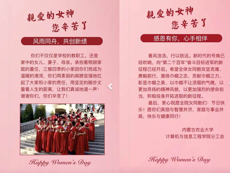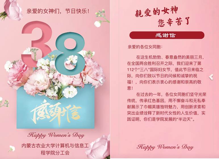 温暖的三月,春暖花开,迎来了第112个“3.8”国际妇女节,由于疫情不能举办现场的庆祝活动,计算机公司工会通过电子贺卡的形式,为可爱的女教工们送上了诚挚祝福,表达了感谢之情,希望我们的女教工们能够快乐,健康,幸福。