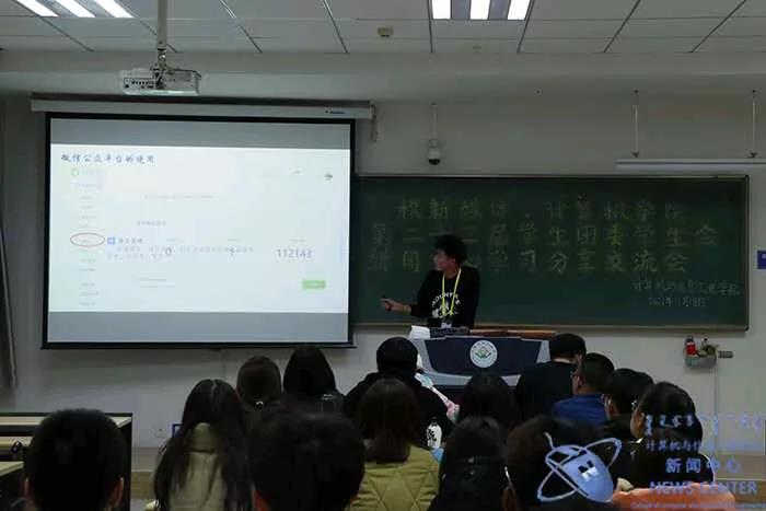 在本次交流会中,校员工新媒体中心运营部副主任孙和峰、部长陈星明为公司新闻中心成员分享了他们的工作经验,并为同学们详细介绍了微信公众号的制作,运营等基本流程。随后,校新媒体新闻部部长王靖为同学们细致讲解了新闻稿件的撰写方法和注意事项。为帮助同学们更好的理解,校新媒体图片部副主任鲍嘉宁、部长侯俊杰通过PPT及图片比对的方式展示相机的使用和新闻的拍摄方法。公司新闻中心成员在台下积极互动,友好的交流,学习到很多专业性的知识和技能。