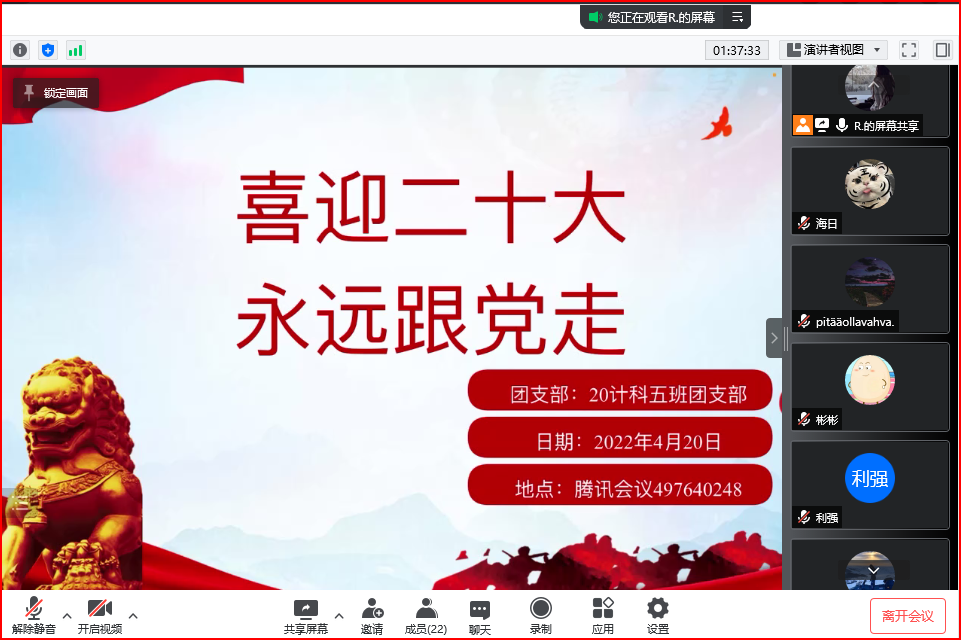 为了团结引领广大青少年贯彻落实学习党的二十大精神、坚定跟党走、建功新时代,引导团员和青少年深刻感悟“两个确立”的决定性意义,4月13日20级计科1班、4月20日20级计科5班分别在腾讯会议线上开展了“喜迎二十大,永远跟党走,奋进新征程”团日活动。