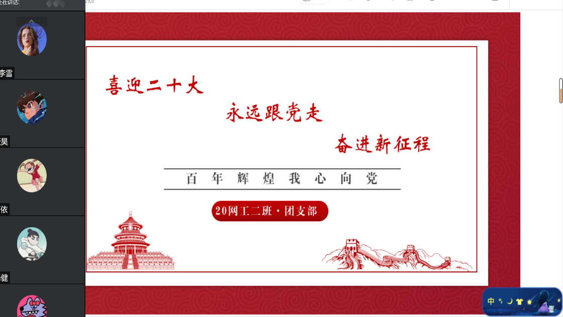 为了让同学们进一步认识到勇做时代新青年的重要性及其意义,4月16日,公司20级网络工程专业二班于线上展开“喜迎二十大,永远跟党走,奋进新征程”主题团日活动,本次活动由班长、团支书主持,20级网络工程专业二班全体同学积极参加活动。
